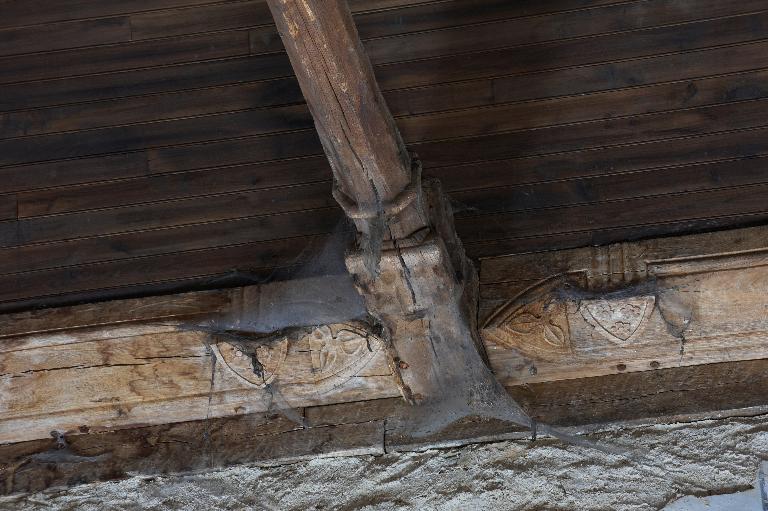 En travers du chœur ou de la nef, les entraits sont décorés en leur centre de feuillages ou de bagues moulurées. À leurs extrémités, ils semblent jaillir de la gueule de monstres appelés à juste titre engoulants.