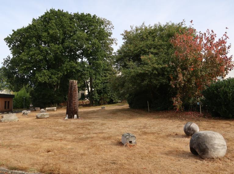 Description : un totem en bois de 3,5 m de hauteur et du petit mobilier permettant de s'asseoir