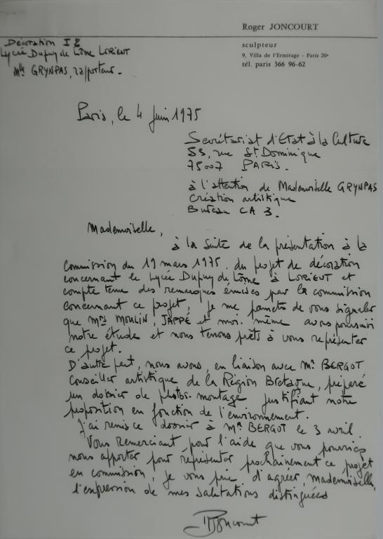 Les archives de commission nationale des travaux de décoration des édifices publics offrent un autre angle de vue. Réunie une première fois le 19 mars 1975, elle a demandé aux artistes de poursuivre leur étude en liaison avec François Bergot, conservateur du Musée des Beaux-Arts de Rennes, conseiller artistique régional. Elle a notamment demandé à Roger Joncourt plus de variété formelle pour ses sculptures en béton et souhaité que l'architecte vienne lui-même présenter le programme de décoration (il semble que Georges Tourry ait été invité dans un premier temps, et que le sculpteur ait indiqué qu'il convenait désormais d'inviter René Ouvré).