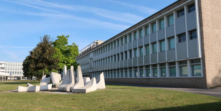 Dans un campus éclaté, l’œuvre est pensée comme un point de rencontre, de repos. Les éléments sculptés peuvent servir de fauteuil.