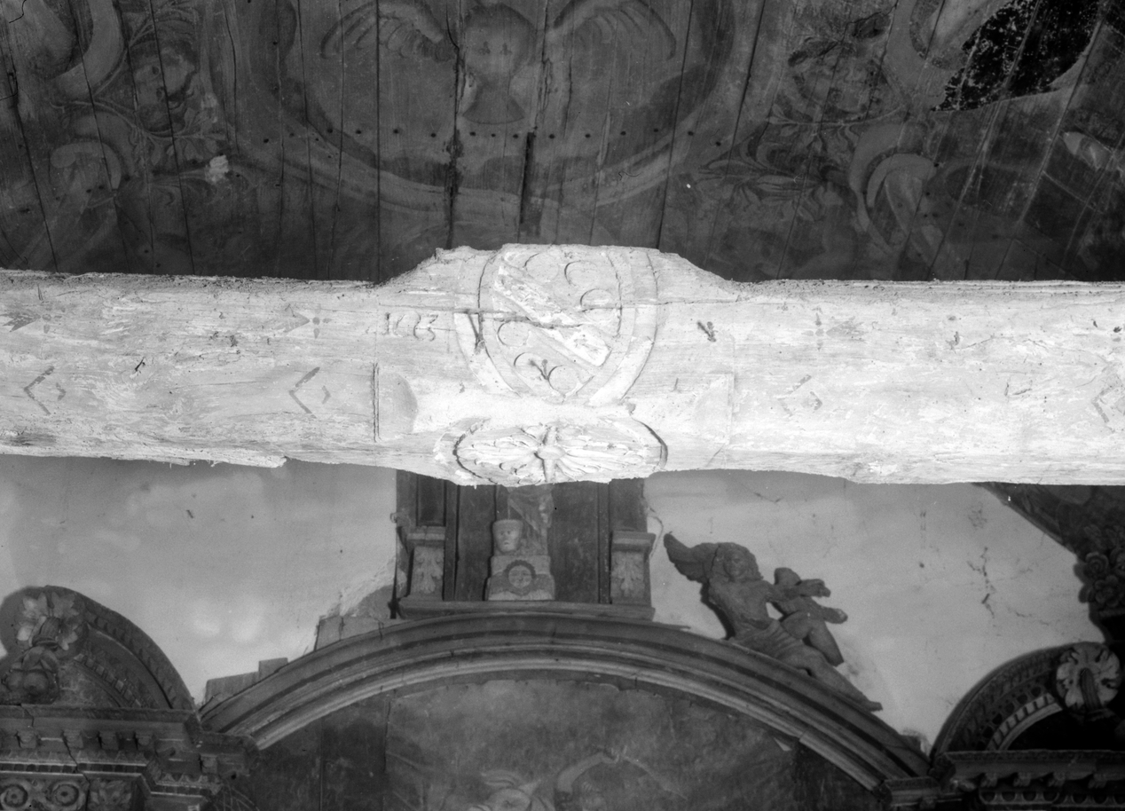 Charpente : détail d'un entrait armorié daté 1623Immatriculation