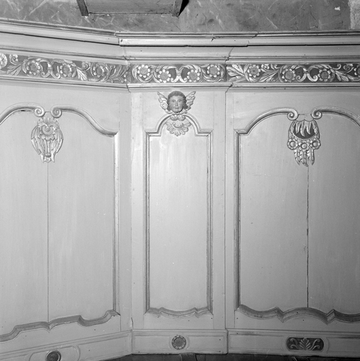 Lambris du choeur, détail des panneaux de l'angle sud-est.Immatriculation