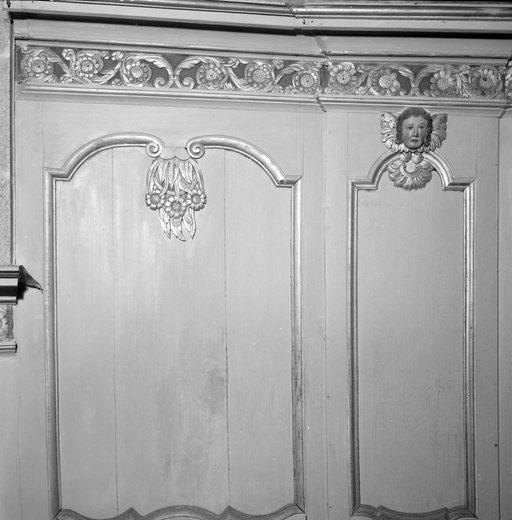 Lambris du choeur, détail des panneaux à l'extrémité de l'angle nord-est.Immatriculation