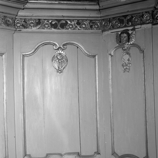 Lambris du choeur, détail des panneaux de l'angle nord-est.Immatriculation