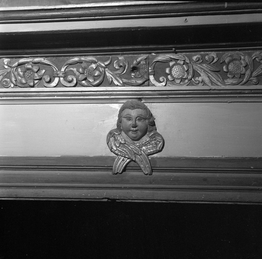 Lambris du choeur, détail de la figure sculptée au-dessus de la porte.Immatriculation