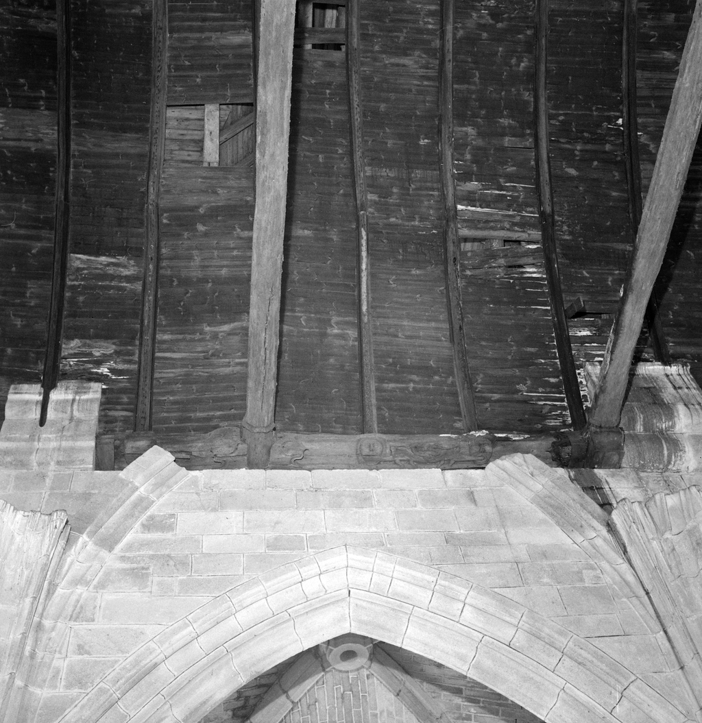 Sablières, détail au-dessous de l'arcade ouest du mur sud de la nef.Immatriculation