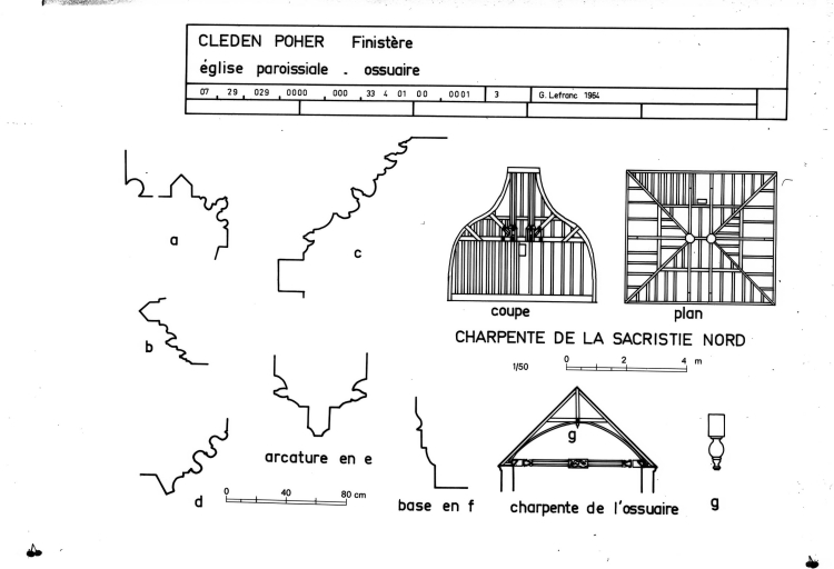 Détails modénature, plan et coupe de la charpente de la sacristie, coupe de la charpente de l'ossuaireImmatriculation