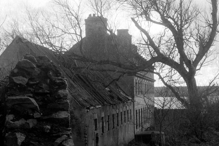 Vue du grand bâtiment : élévation occidentale (état en 1967). Accosté au nord, bâtiment à neuf travéesImmatriculation