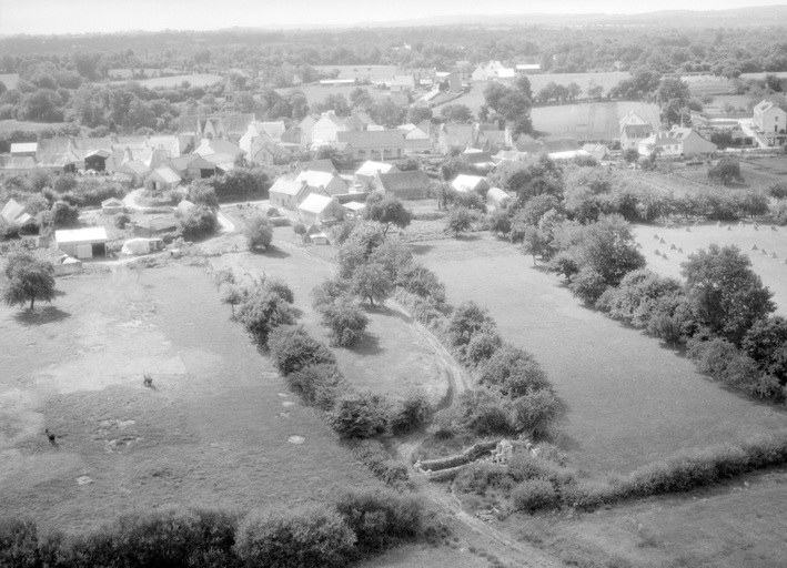 Vue aérienne de situation (au 1er plan la fontaine ; à l'arrière plan, le bourg et l'église)Immatriculation