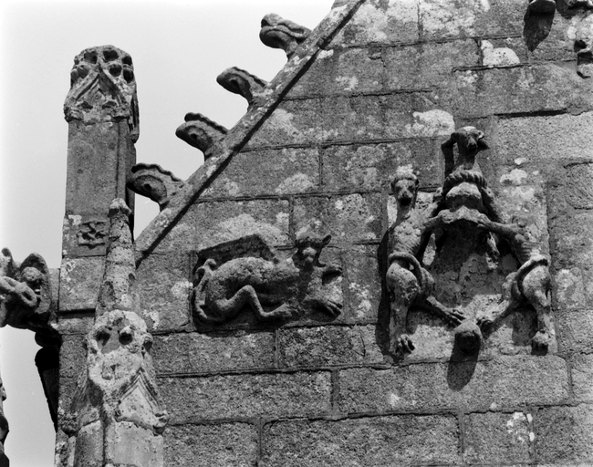 Pignon du porche sud, détail : relief de l'extrémité est du pignonImmatriculation