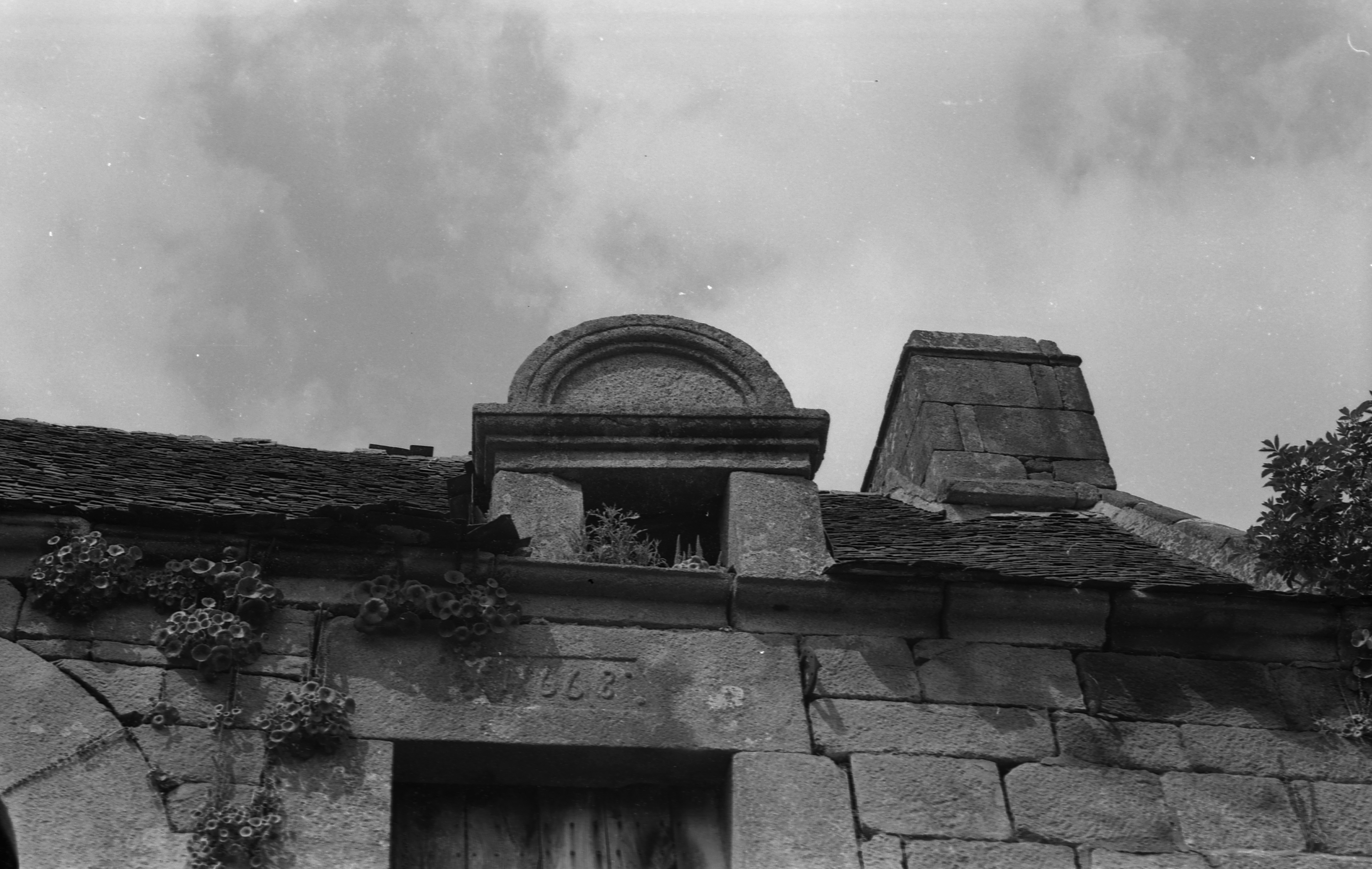 Logis ouest daté 1668, détail de la lucarne (détruite après inventaire pour la vente des pierres), état en 1967Immatriculation