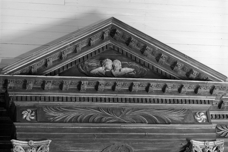 Croisillon sud, mur est : retable, détail du frontonImmatriculation
