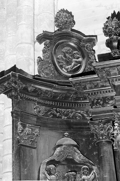 Croisillon sud, mur est, retable : fronton, détail du médaillon nord : saint MathieuImmatriculation