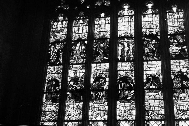 Maîtresse-vitre : Verrière à personnages : Vie de saint Jacques, Vie du Christ (baie 0),