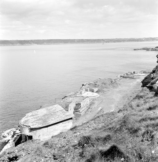 Vue de la partie ouest de la batterie de l'îlot des Capucins en 1969. De gauche à droite : poste de projecteur français, deux plate-formes pour canon (dont une pour 47 mm TR)Immatriculation