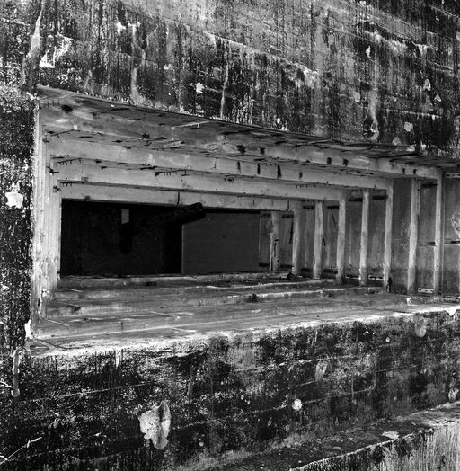 Vue de l'une des deux embrasures bétonnées (état en 1969). L’embrasure se caractérise par son ébrasement extérieur à redans conçu pour éviter les coups d'embrasureImmatriculation
