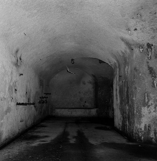 Vue du couloir de circulation des deux chambres de tir (état en 1969). Au fond, le lavoir - citerne pour nettoyer les pièces d'artillerieImmatriculation