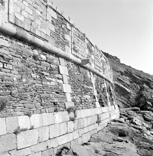 Vue de la batterie de Cornouaille en 1969 : escarpe, chaînes harpées en pierres de taille de graniteImmatriculation