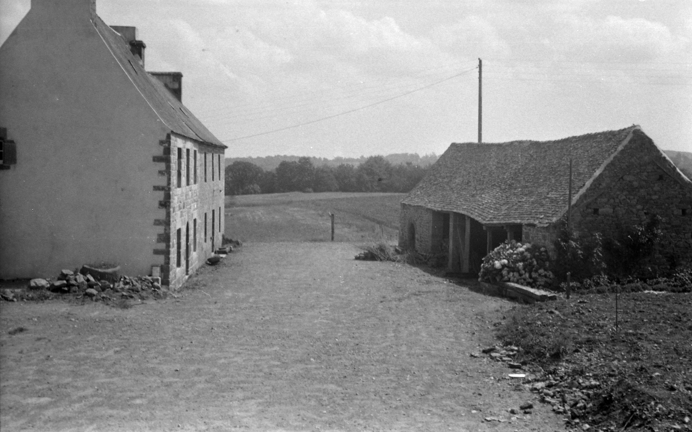 Trémel, La Villeneuve : ferme, vue générale depuis l'ouest, photographie de 1970. Face au deux logis, une remiseImmatriculation
