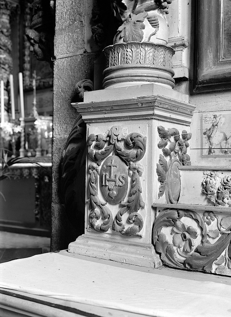 Retable, détail du piédestal de la colonne de gauche.Immatriculation