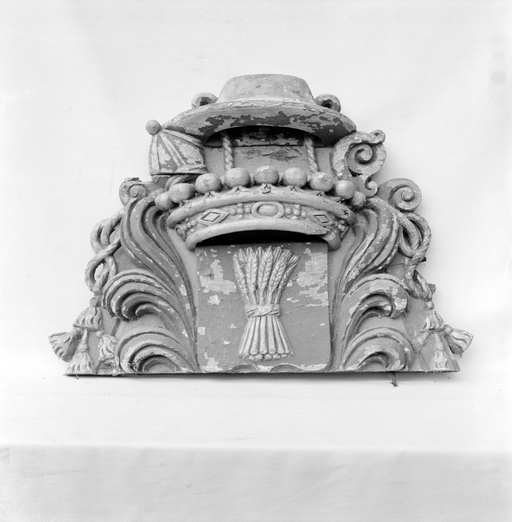 Ensemble de l'autel-retable nord : couronnement du retable portant des armoiries (état en 1970)Immatriculation