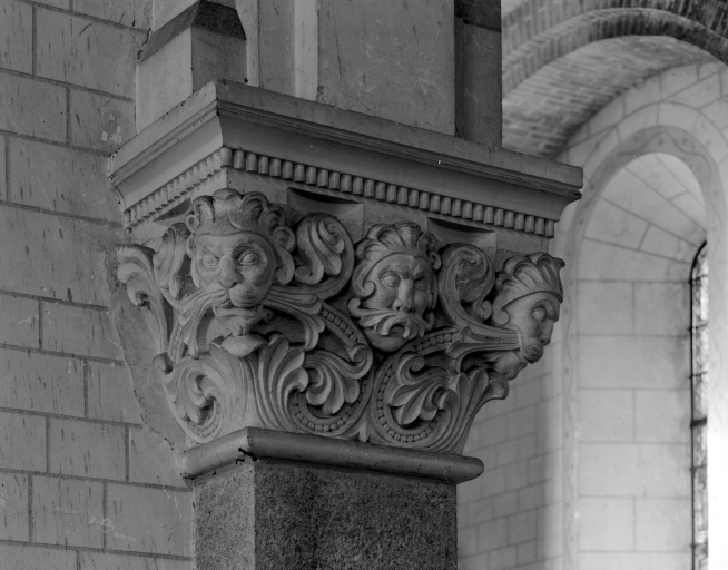 Chapiteau de la nef, 1ère pile nord, face est, trois têtes feuillus.Immatriculation