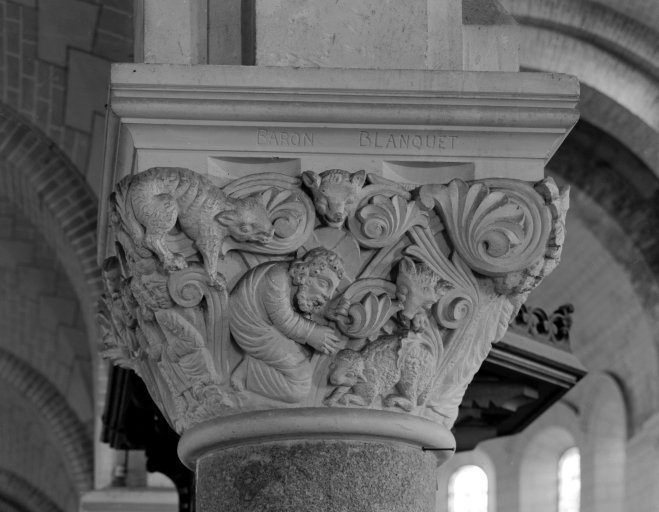 Chapiteau de la nef, 4ème pile nord, face ouest, la brebis égarée.Immatriculation