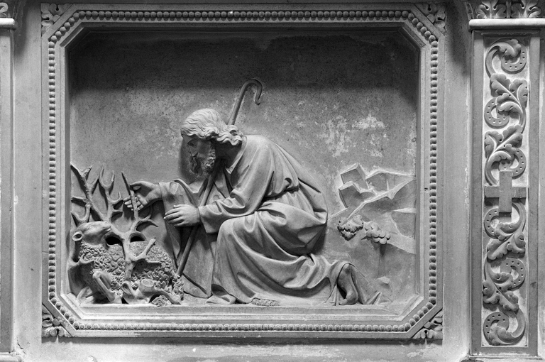 Autel retable sud, détail : Le Bon Pasteur retrouve la brebis égarée.Immatriculation