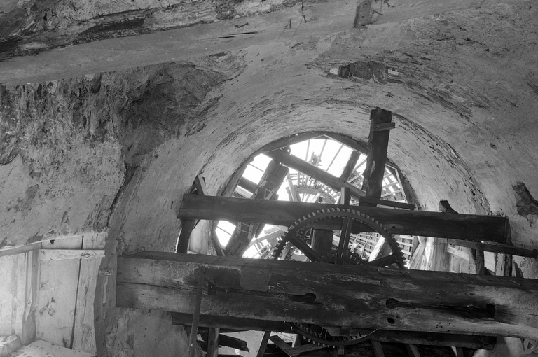 Mécanisme et parties hautes, vue prise de bas en haut.Immatriculation