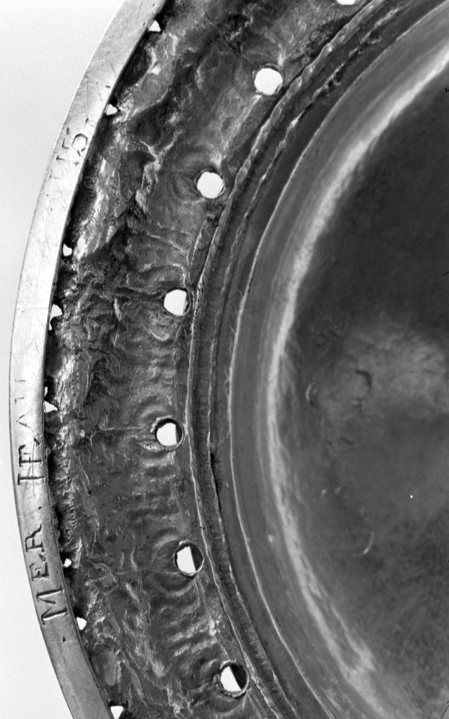 Vue de détail de la bordure du pied du calice.Immatriculation