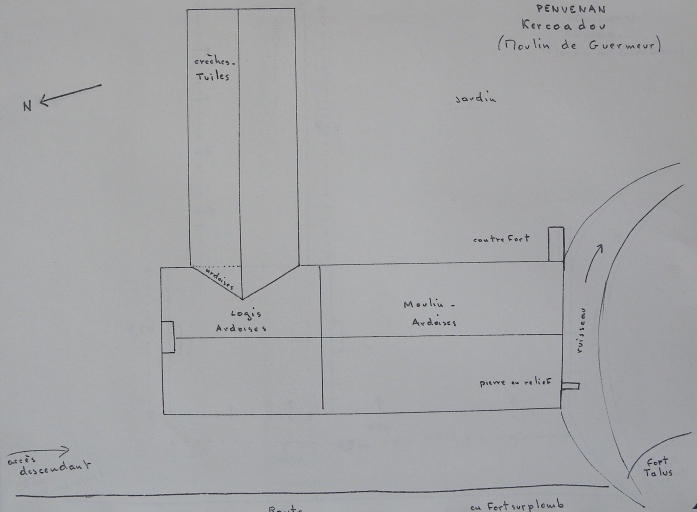 Dessin : plan de situation du moulin de Guermeur (Nicole Chouteau, ADAGP, pré-inventaire, 1971)Immatriculation