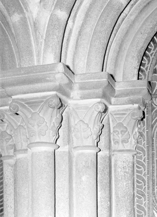 Corps de bâtiment D, salle capitulaire, mur est, chapiteaux de la baie géminée à gauche de l'autel (1965)Immatriculation