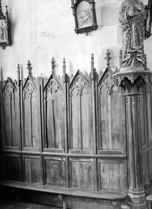 Lambris de hauteur, autel (3), tabernacle (3), clôture de choeur, stalles, style néo-gothique, chapelle Saint-Yves (Priziac),