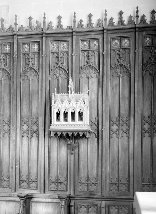 Lambris de hauteur, autel (3), tabernacle (3), clôture de choeur, stalles, style néo-gothique, chapelle Saint-Yves (Priziac),