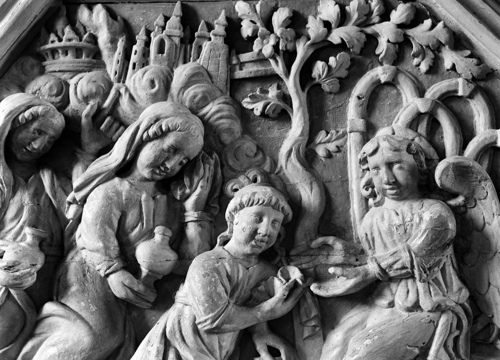 Détail du panneau, aile droite du premier niveau : bas-relief 'saintes Femmes au tombeau'Immatriculation