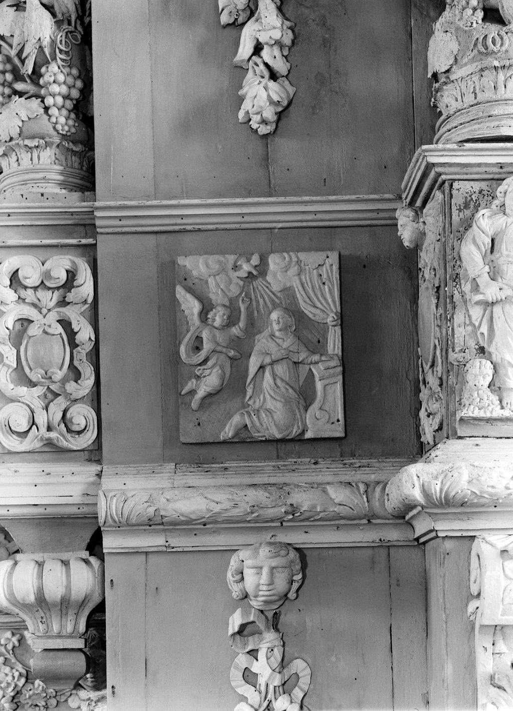 Détail panneau de la travée gauche de l'aile droite : bas-relief 'l'Annonciation'Immatriculation