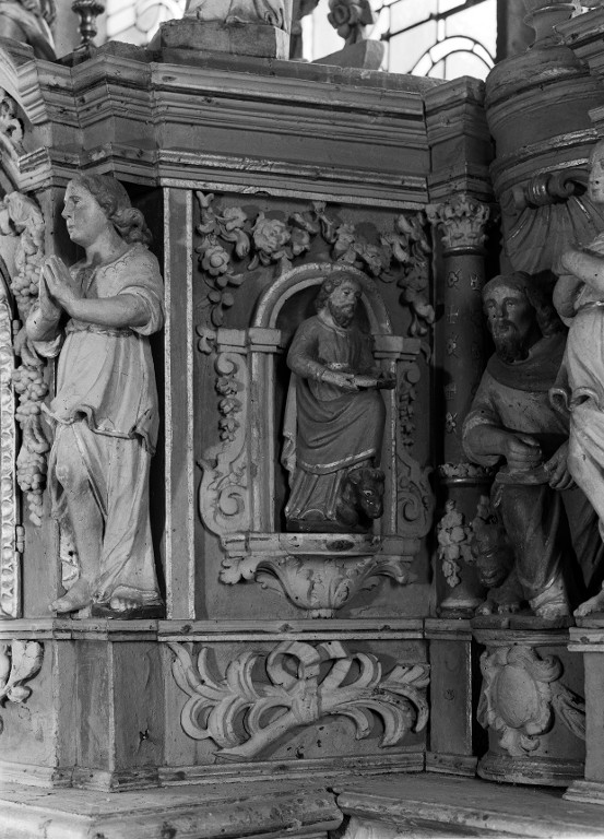 Retable central, détail, face sud du tabernacle, statuette de saint LucImmatriculation