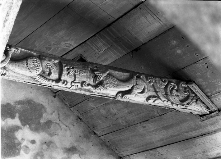 Quéménéven, église paroissiale Saint-Ouen : entrait sculpté, bras nord du transept, état en 1972Immatriculation