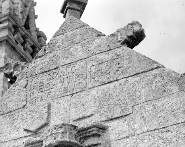 Façade sud, porche, détail du sommet du pignonImmatriculation