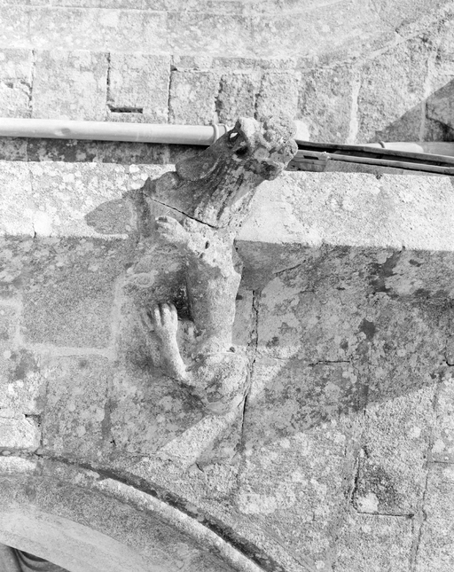 Quéménéven, église paroissiale Saint-Ouen : façade sud, le porche, détail crossette gauche, état en 1972Immatriculation