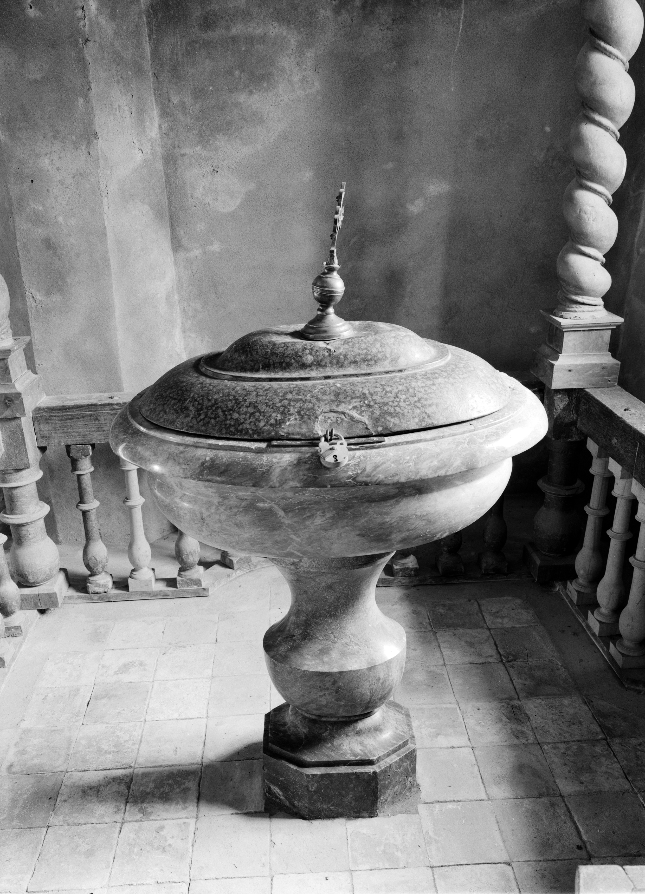 Fonts baptismaux, clôture des fonts baptismaux, baldaquin des fonts baptismaux, église paroissiale Saint-Coulitz (Saint-Coulitz),