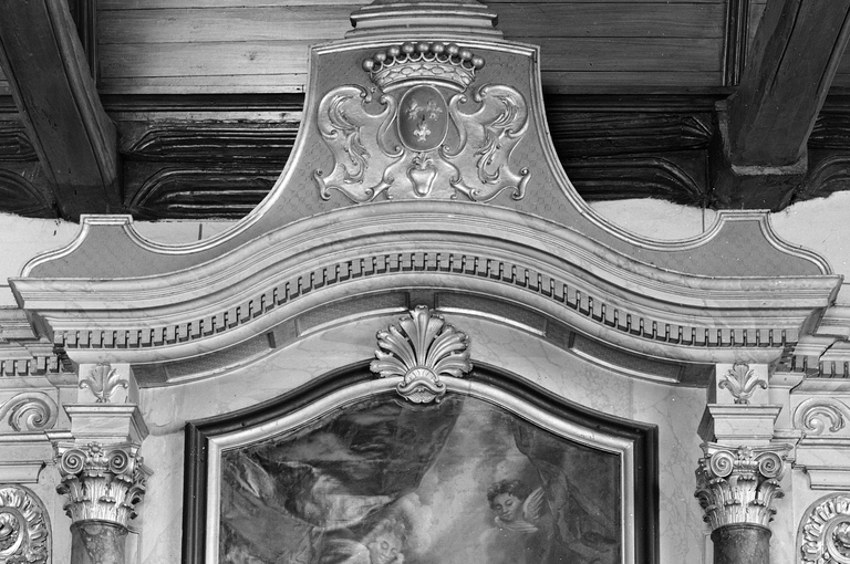Ensemble autel-retable sud, couronnement.Immatriculation