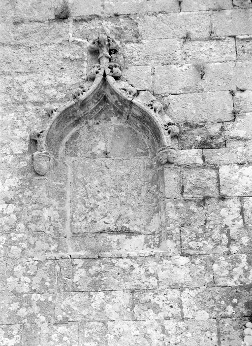 Armoiries buchées et inscription non déchiffrée dans la niche principale de la façade occidentale.Immatriculation