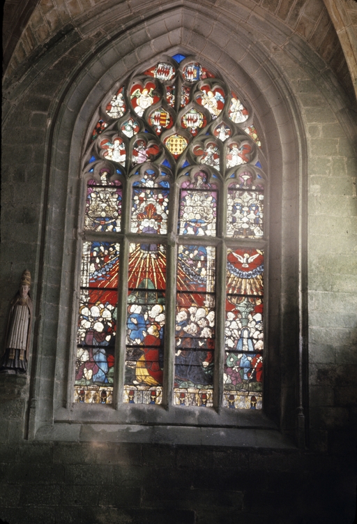 Verrière (verrière figurée) : Ascension, Pentecôte, chapelle Sainte-Barbe (Le Faouët),