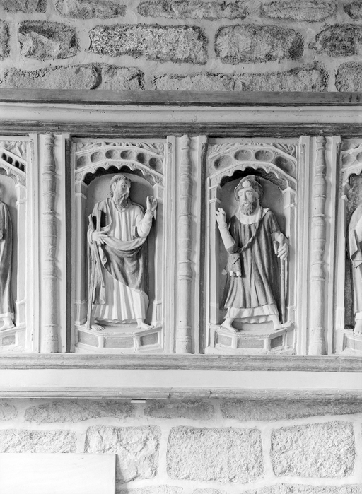 Haut relief - Panneaux sculpté des 12 apôtres : mur ouest du porche, saint André et saint Jacques le Majeur.Immatriculation
