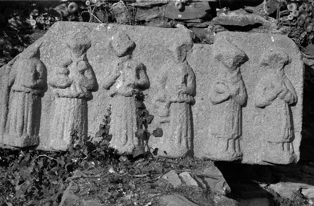 Minihy-Tréguier : manoir de Kerrivoalan, détail d'une pierre historiée, photographie de 1973Immatriculation