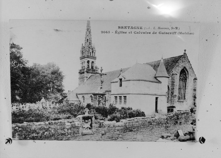 Carte postale ancienne : Eglise et calvaire avant destruction de l'enclos, vue prise du sud-estImmatriculation