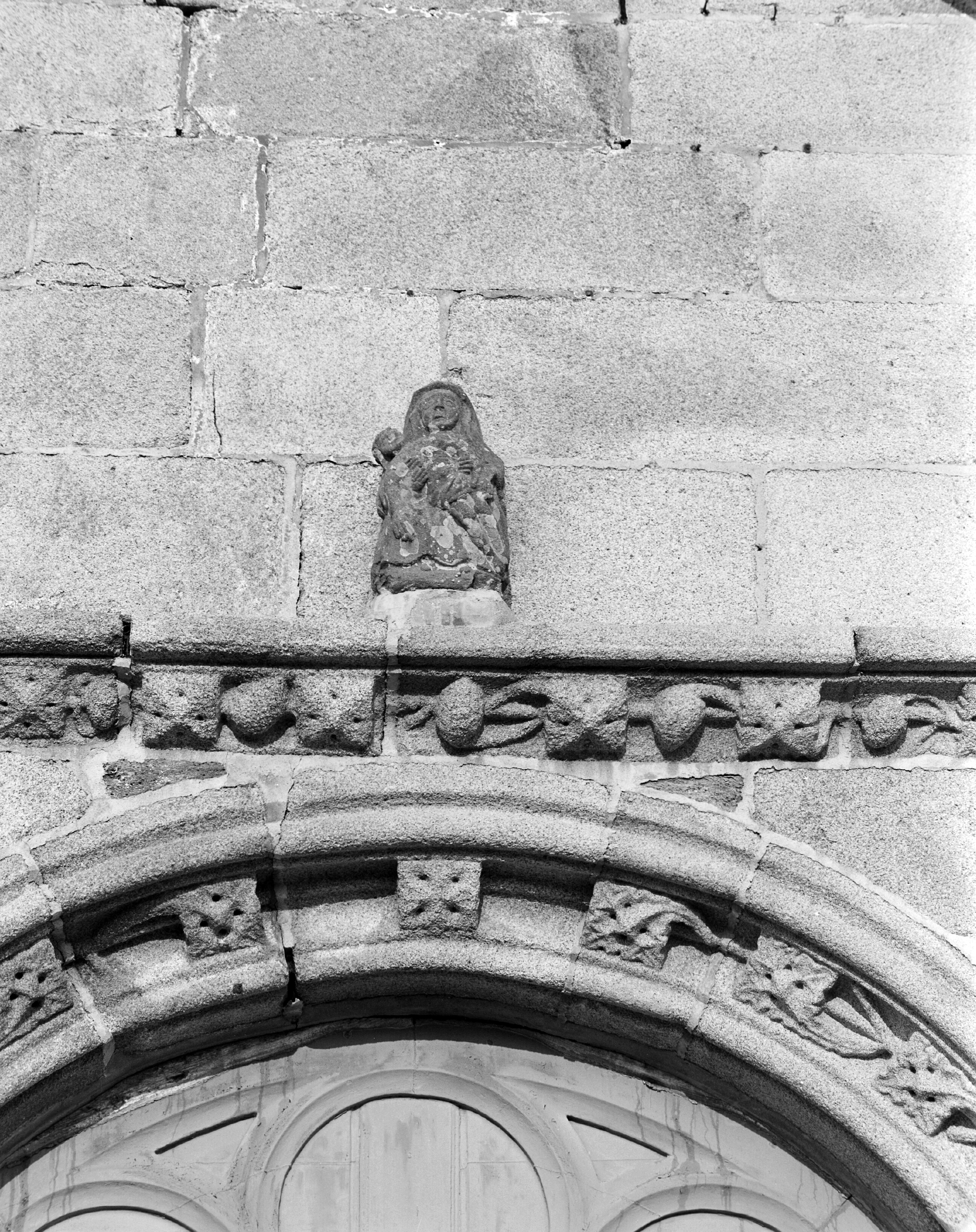 Minihy-Tréguier, rue de l'Église : église Saint-Yves, élévation ouest, détail du porche, photographie de 1974. Une Vierge de Pitié ou Pietà surmonte la porteImmatriculation