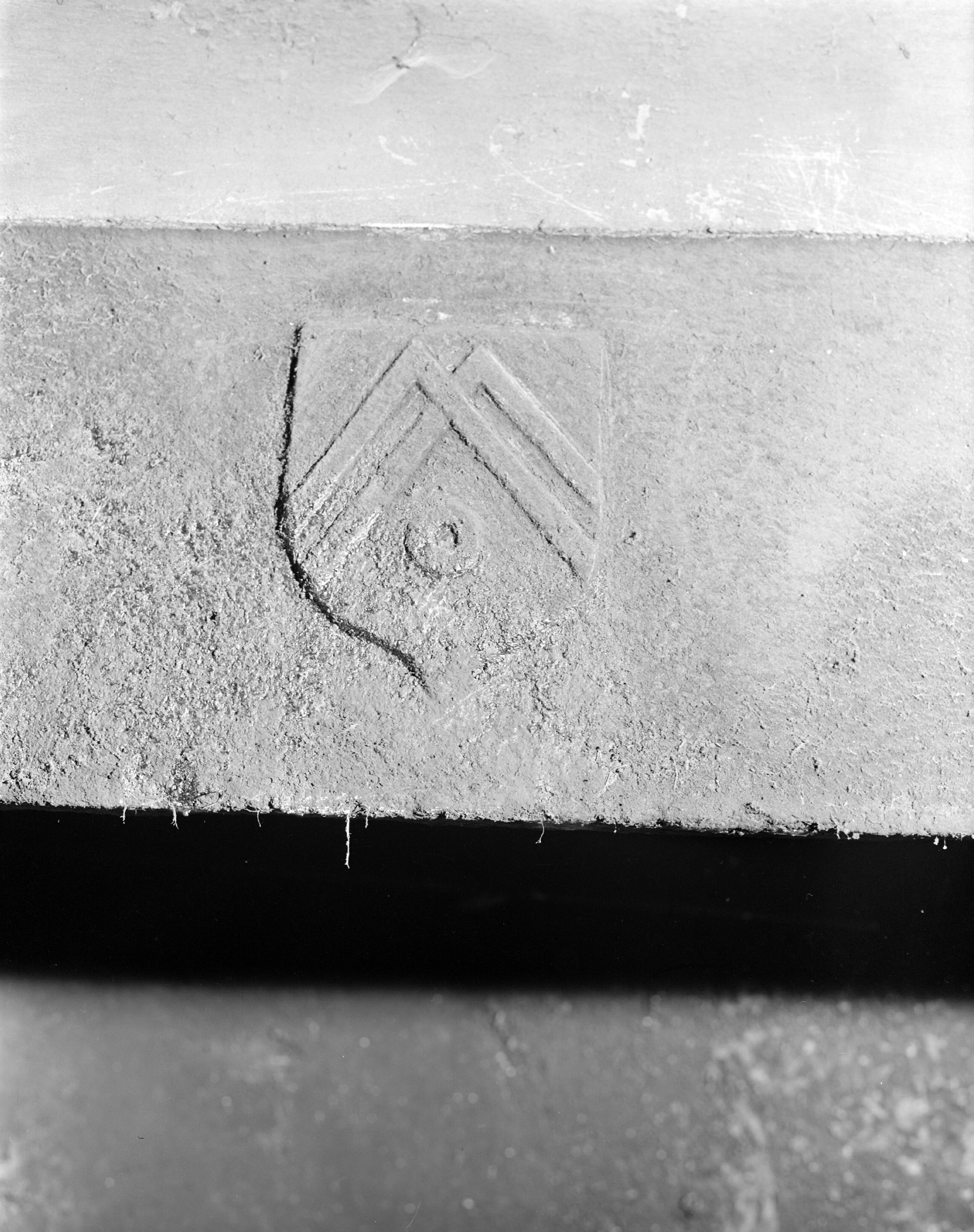Minihy-Tréguier, Crec'h an Goué : dépendance à usage de porcherie, détail d'une cheminée armoriée, photographie de 1974. Ces armoiries, identifiées comme celles de la famille Pavic, sont : "d'azur à deux chevrons entrelacés de sable, accompagné en pointe d'un annelet de même"Immatriculation