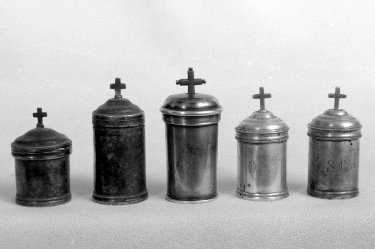 Ensemble de cinq ampoules aux saintes huiles : celle portant l'inscription S.C. a disparuImmatriculation